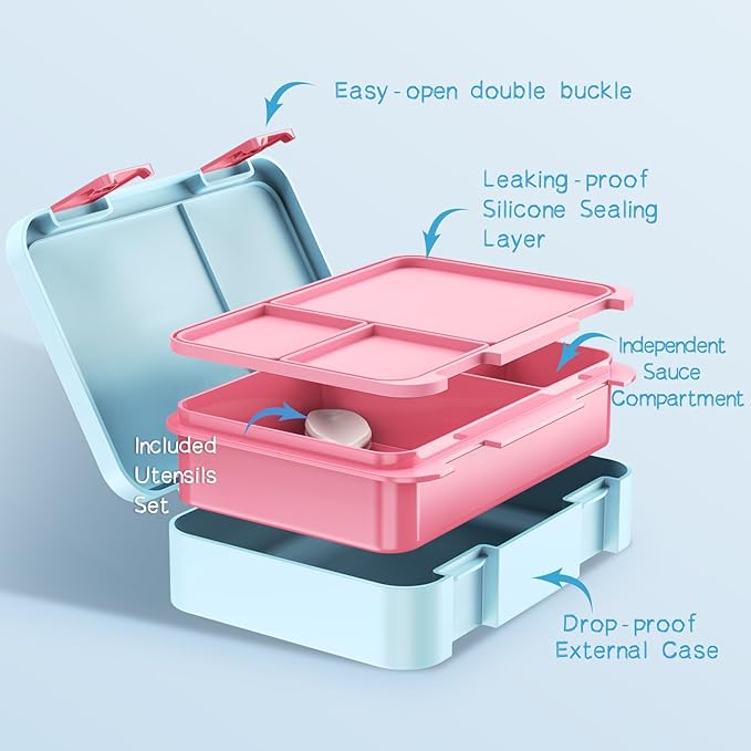 - 【43OZ BENTO LUNCH BOX】The BPA free ACESAK lunch box kids (43oz/1300ml) features six compartments for diverse meals, ensuring your child's meals are not only delicious but also packed with balanced nutrition. Detachable, dishwasher-safe (Inner tray & silicone seal only), and freezer/ Inner tray microwave-compatible, making it perfect for packing preferred foods like sandwiches, burgers, pasta, fruits, veggies, salads, or desserts in an organized manner.