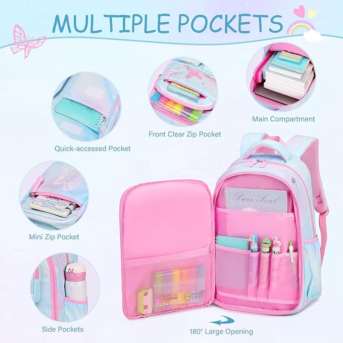 - 【LARGE CAPACITY】Measuring at 11*7.4*16.5", this bookbags for girls offers convenient organization for all your belongings. Roomy main compartment of this bag for school can hold 15.6" laptop, textbooks, magazines, A4 files, the middle compartment with slots fit the school basic essential, note book, and pencil case, 4 front outer pockets afford quick access to on-the-go essentials, 2 side pockets for water bottle and umbrella.