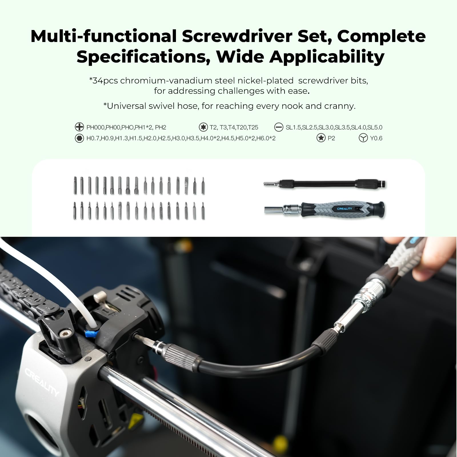 - 【Multi-functional Screwdriver Set】Complete Specifications, Wide Applicability. 34pcs chromium-vanadium steel nickel-plated screwdriver bits, for addressing challenges with ease. Universal swivel hose, for reaching every nook and cranny.