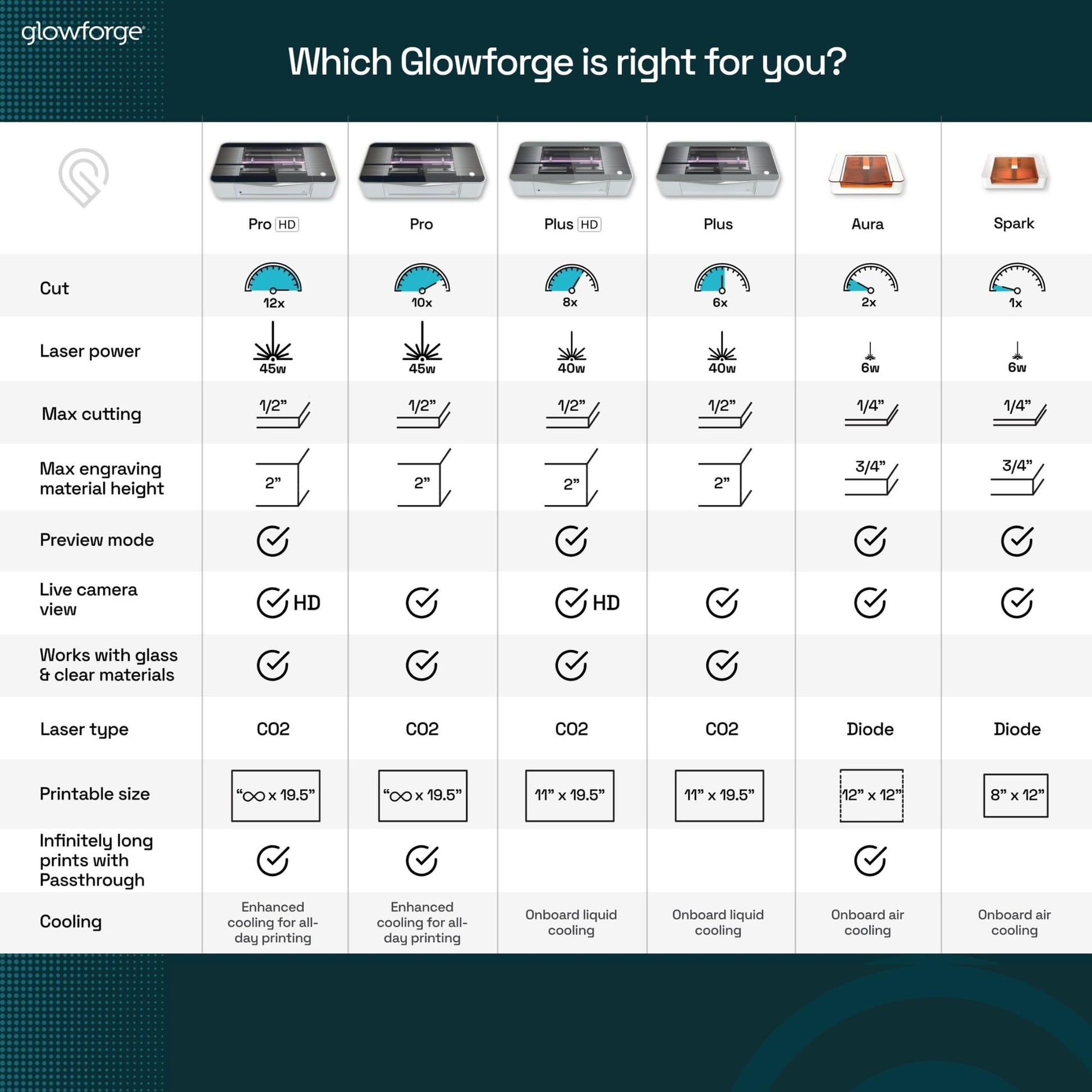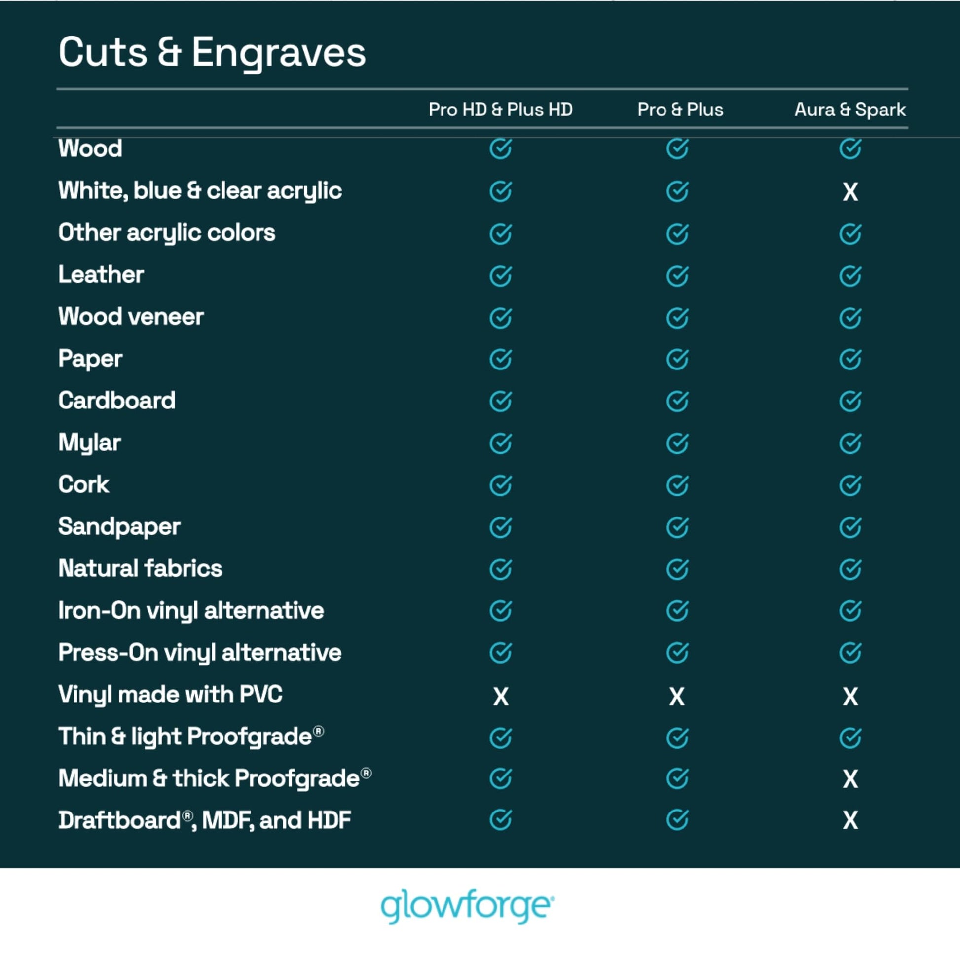- Unlock a new dimension to your creativity! Glowforge Aura is compatible with hundreds of materials including wood, leather, paper, cardboard, stickers, iron on, and many types of acrylic, stone, metal, and food. It is NOT compatible with MDF, vinyl made with PVC, or white, blue, or clear acrylic.