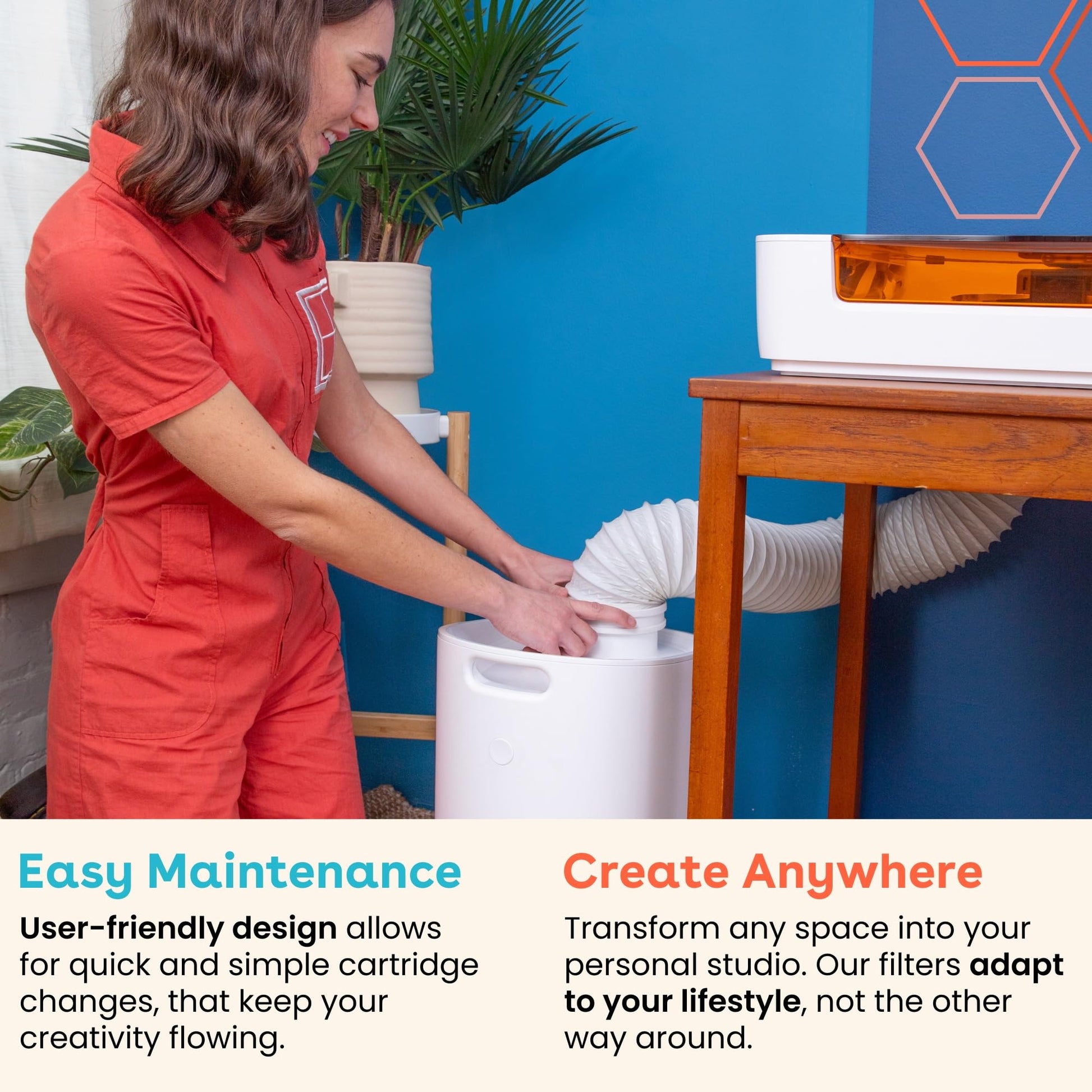 - Long-lasting filter cartridges: Each high-efficiency cartridge provides up to 100 hours of printing time. Ideal for small business owners, and DIY'ers using Glowforge laser machines for crafts, gifts, home decor, retail items, jewelry, and more.