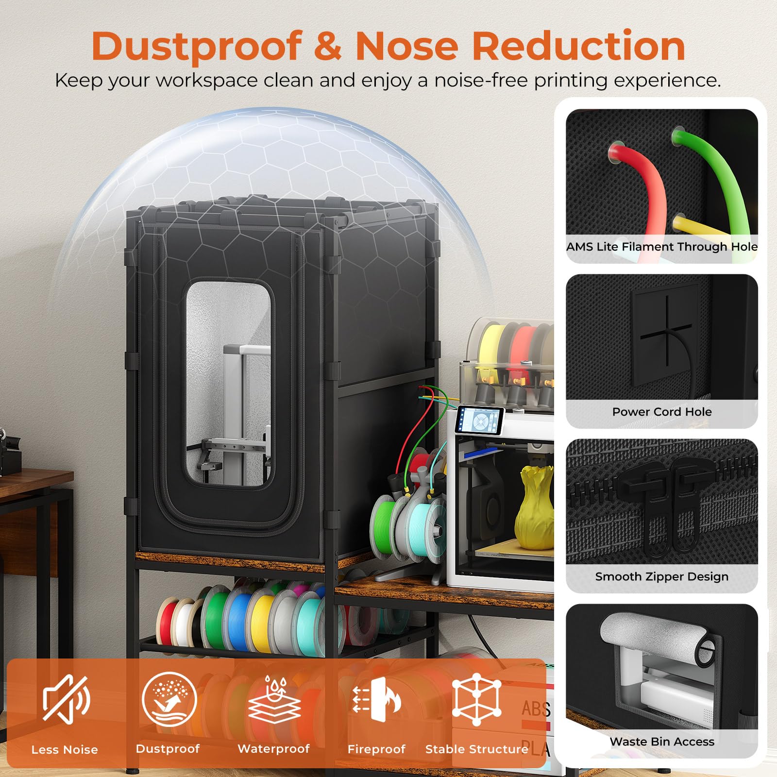 - 【Quiet, Dustproof 3D Printer Enclosure】The 3D printer protective cover features a sturdy structure and fire-resistant materials, significantly improving equipment safety. Its six-sided fully Enclosed design effectively blocks dust intrusion, ensuring an undisturbed printing process and achieving stable, outstanding printing results. The cover also effectively isolates operating noise, ensuring a quiet and tidy working environment and a noise-free printing experience.