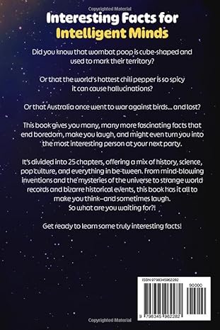The book is divided into 25 chapters, offering a mix of history, science, pop culture, and everything in between. From mind-blowing inventions and the mysteries of the universe to strange world records and bizarre historical events, this book has it all to make you think—and sometimes laugh.