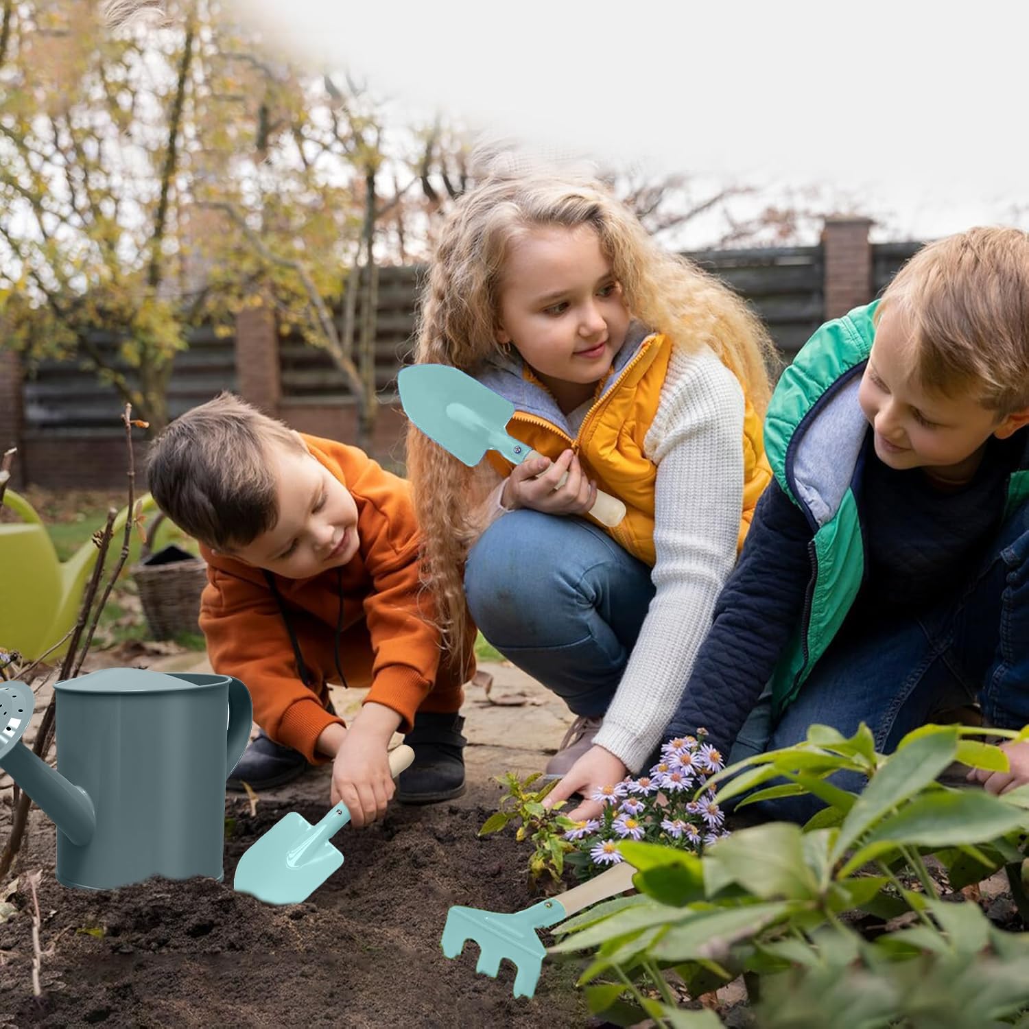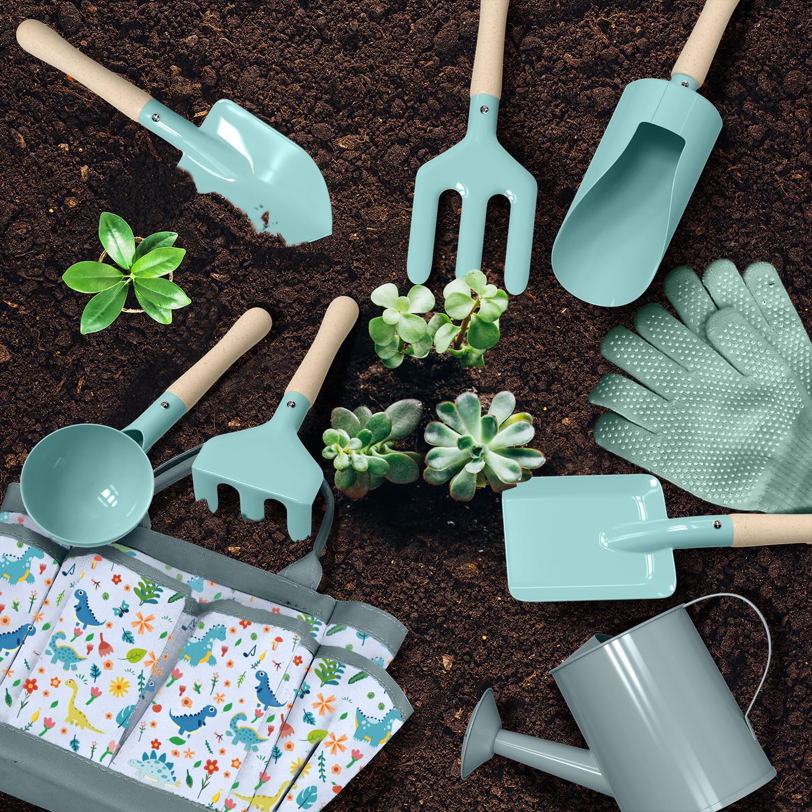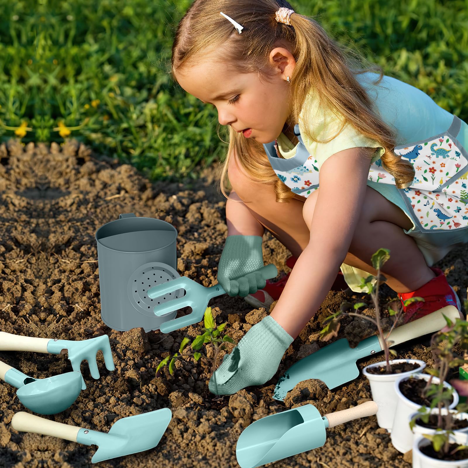 - Kids Gardening Set- This kids gardening tool set bundle with Tote Bag, Large Watering can, Gloves, Cylinder Scoop, Trowel, Spoon, Fork, Rake, Shove,Apron,7 Plant Tags, Kids Gardening Handbook,5 Fruit and Vegetable Sticker. The kids garden set perfect for all your garden needs.
