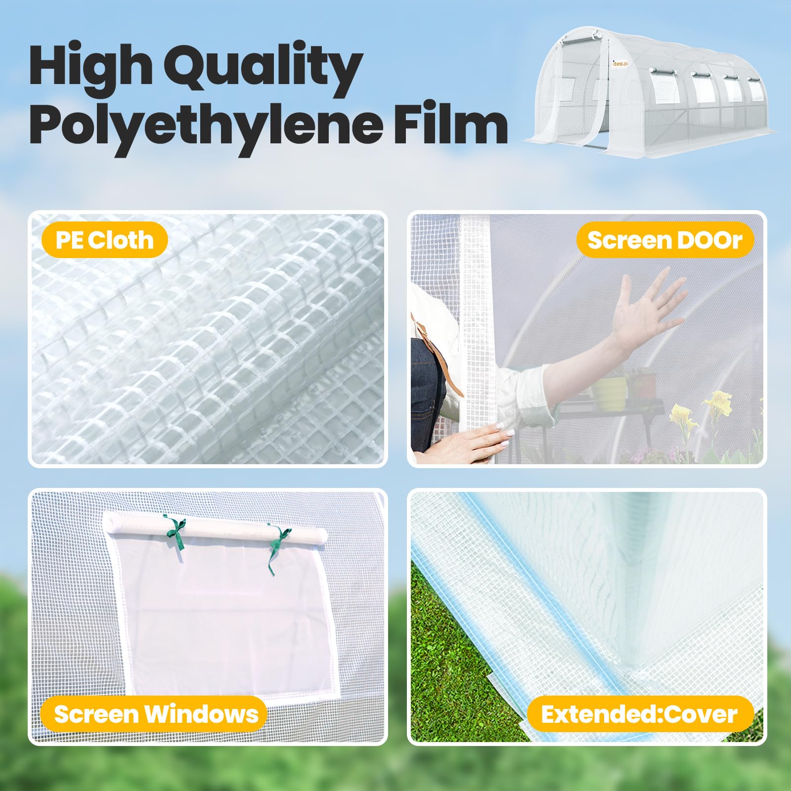 - [Temperature & Humidity Control]--Featured with 8 roll-up screen windows plus 2 door-netting, temperature and humidity can be well-controlled, which increases temperature promoting early spring plant growth, enhances ventilation on hot summer days, and retains warmth during the winter. It keeps plants from pouring rains, winds, and snows.
