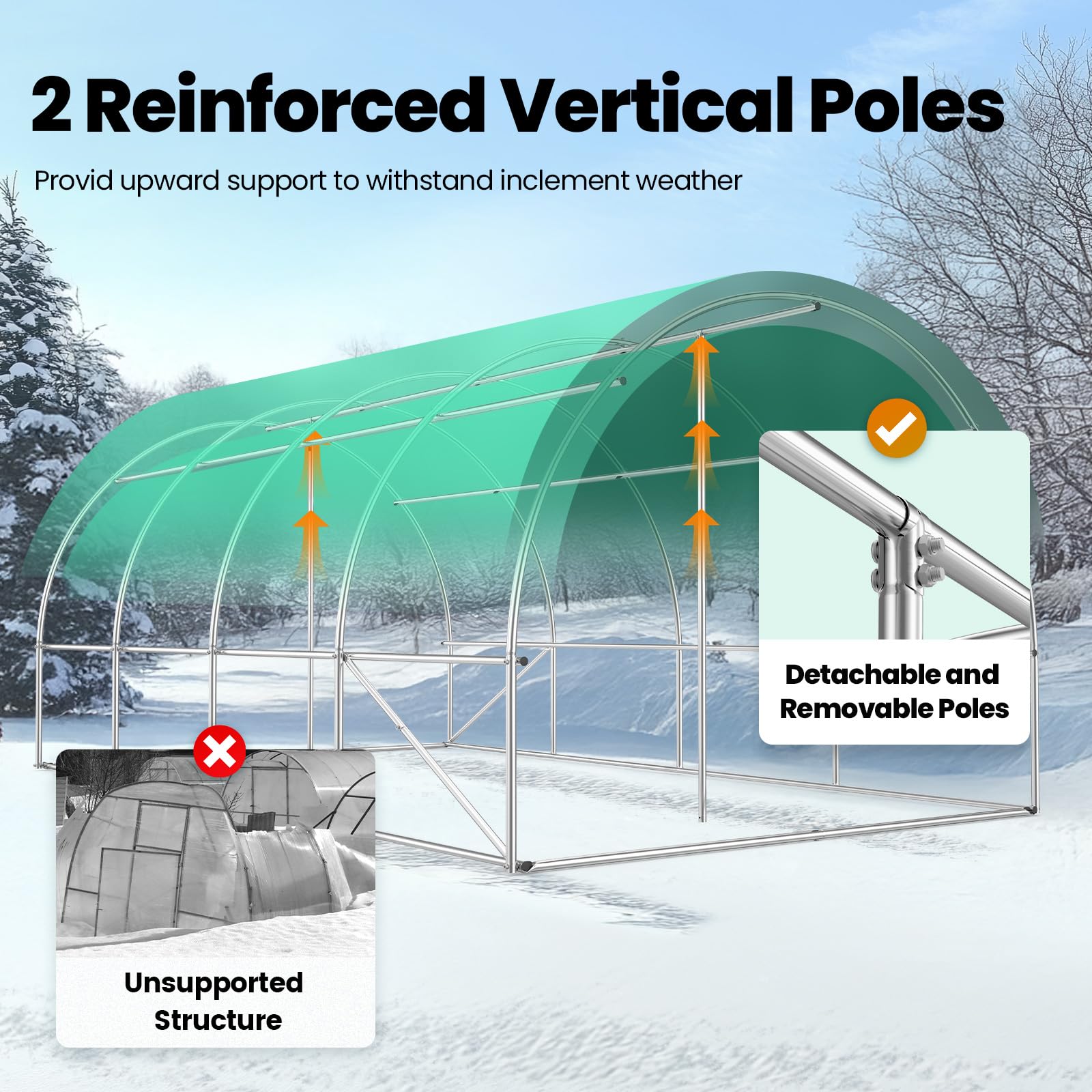 - [Reinforced Frame Structure]--KING BIRD portable plant tent is pro-designed and made of selected galvanized steel, with 3 top crossbars, 2 diagonal & 10 vertical poles at the bottom enhancing the entire structure. 24 stakes and 4 ropes are extra given to fix it on the ground firmly. The 20-foot large space is perfect for you to place abundant home vegetables, flowers plants, etc. [NEW!] 2 supporting stiffeners are added to reinforce the frame.