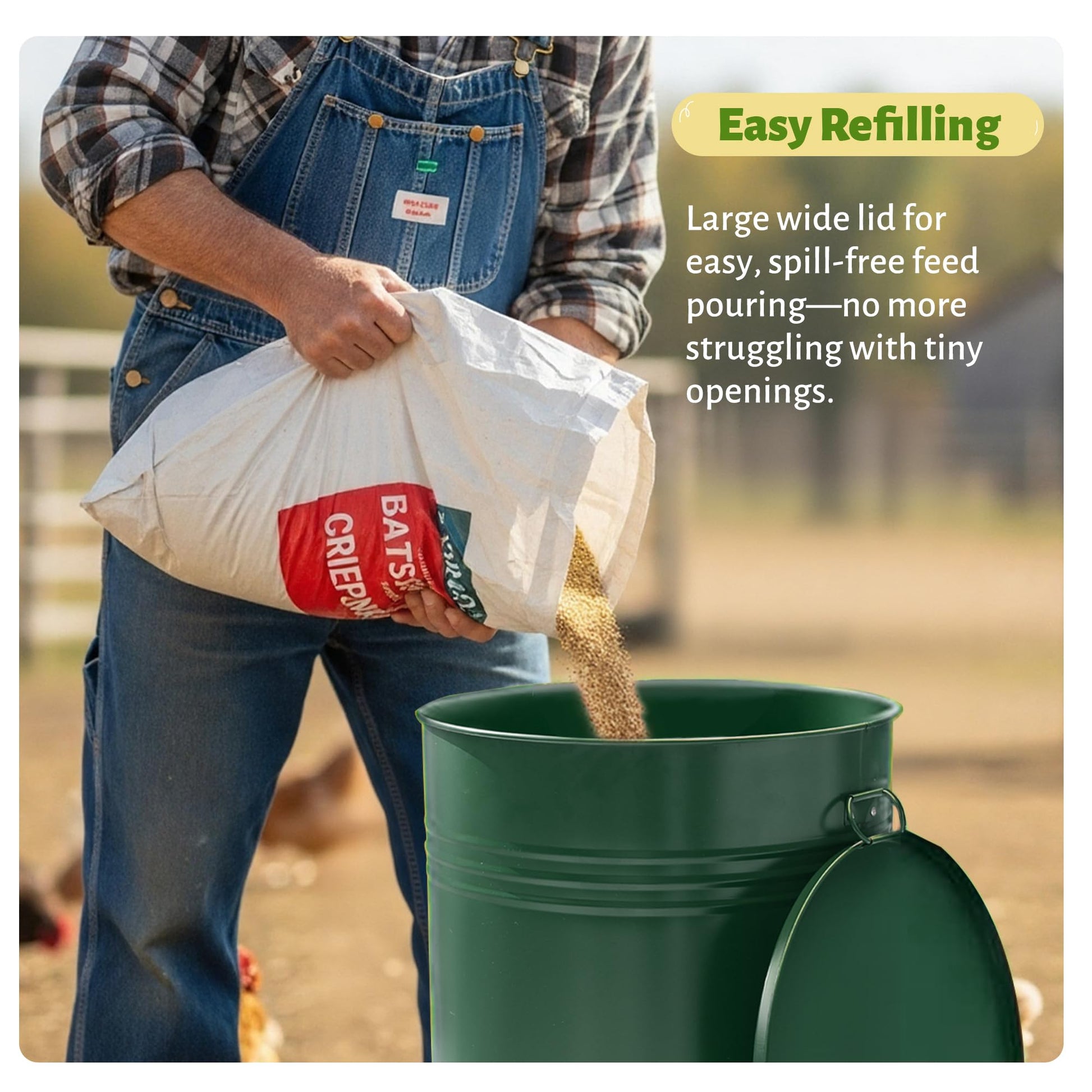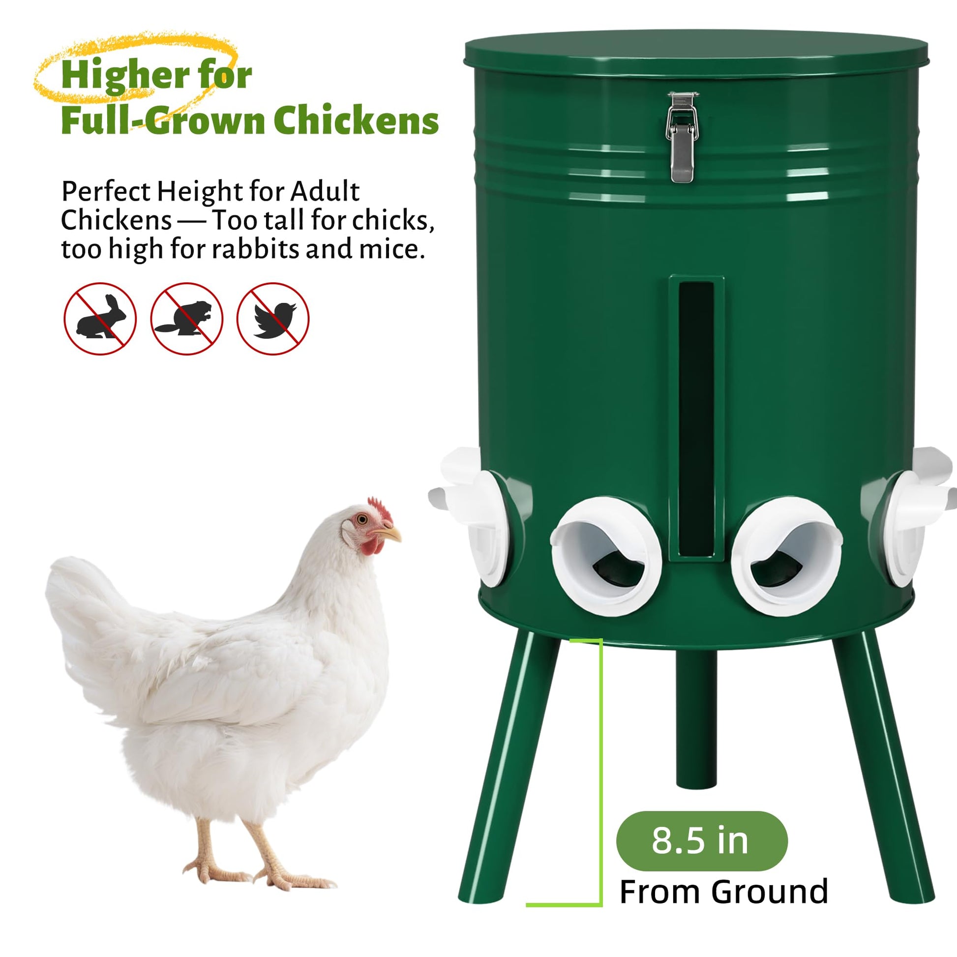 - Rust-Proof Metal Construction: Built with powder-coated steel construction, this chicken feeder resists rust and corrosion for lasting outdoor durability. The sturdy metal build withstands daily coop activity without damage.