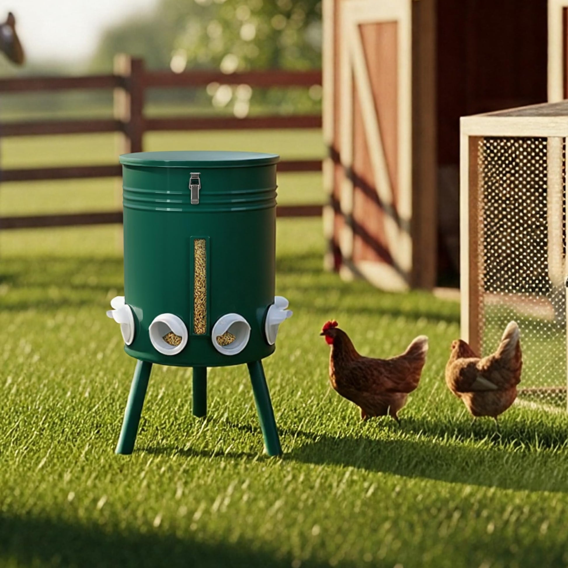 - Barrel Hygiene & Quick Setup: The smooth cylindrical chicken feeder design enables effortless cleaning with no corners for grime buildup. Tool-free assembly takes under 30 minutes for one person using pre-drilled hardware.