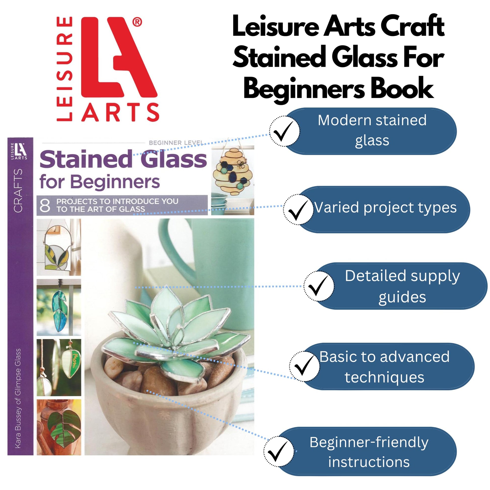 Leisure Arts Craft Stained Glass For Beginners Book- Break traditional rules while breaking glass with these 8 projects designed to introduce you to modern stained glass. Projects include: feather ornament, monstera leaf suncatcher, family tree leaf mobile, pressed botanical necklace, 3D succulent garden, tropical plant mirror, butterfly suncatcher and beehive suncatcher. Instructions and guides lead you through detailed descriptions of necessary supplies, workplace set up, safety information and a different skill for each project. Learn basic stained glass techniques, how to cut and foil curves, black patina, using paint pens, 3D stained glass construction, working with mirrored glass and more. Beginner skill level. 64 pages, softcover.