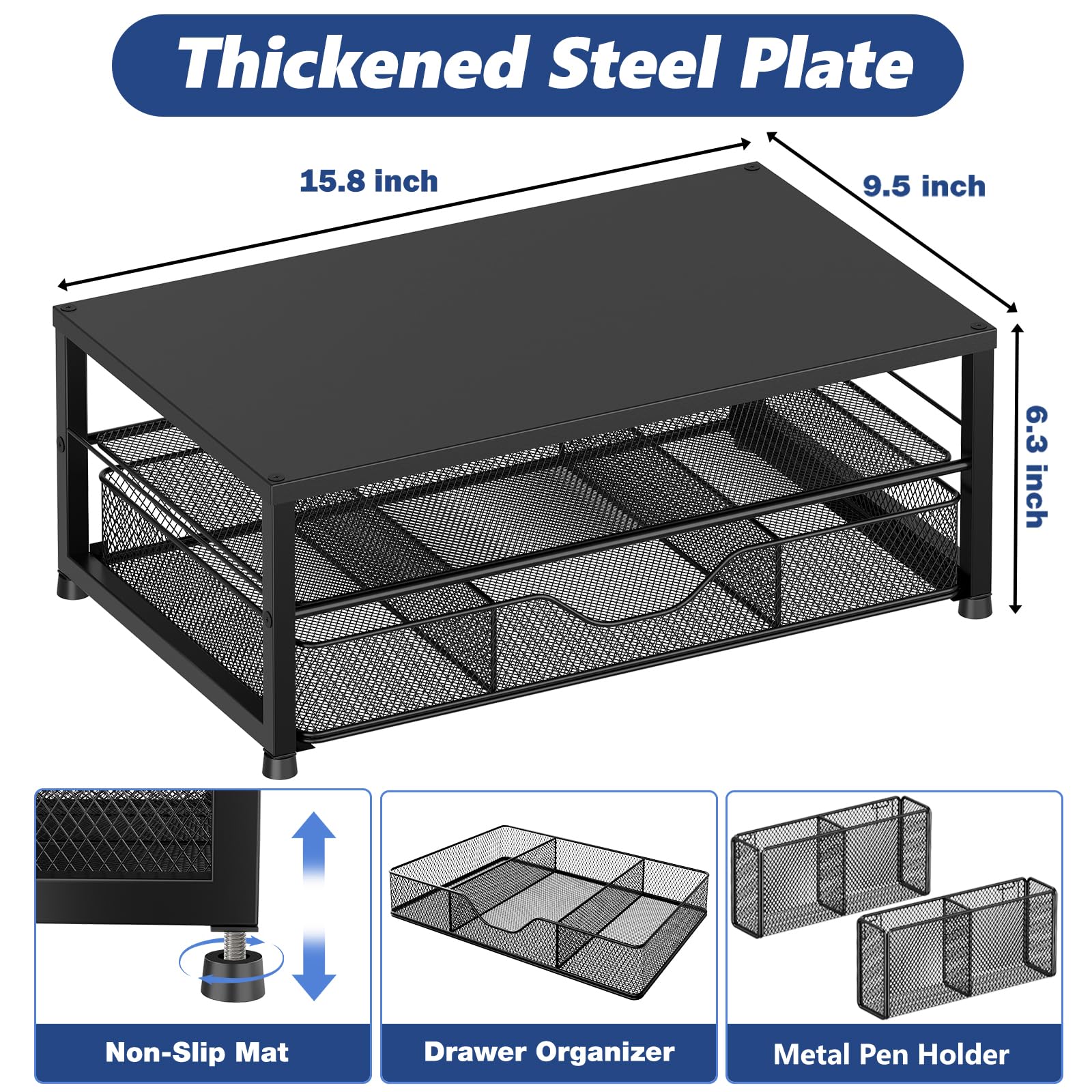 - 【Save Space】:This 2-Tier monitor stand with drawer and 2 hanging pen holders provides ample storage space to keep your office supplies and office desk accessories neatly organized and easily accessible, keeping your workspace tidy and improving your sense of well-being