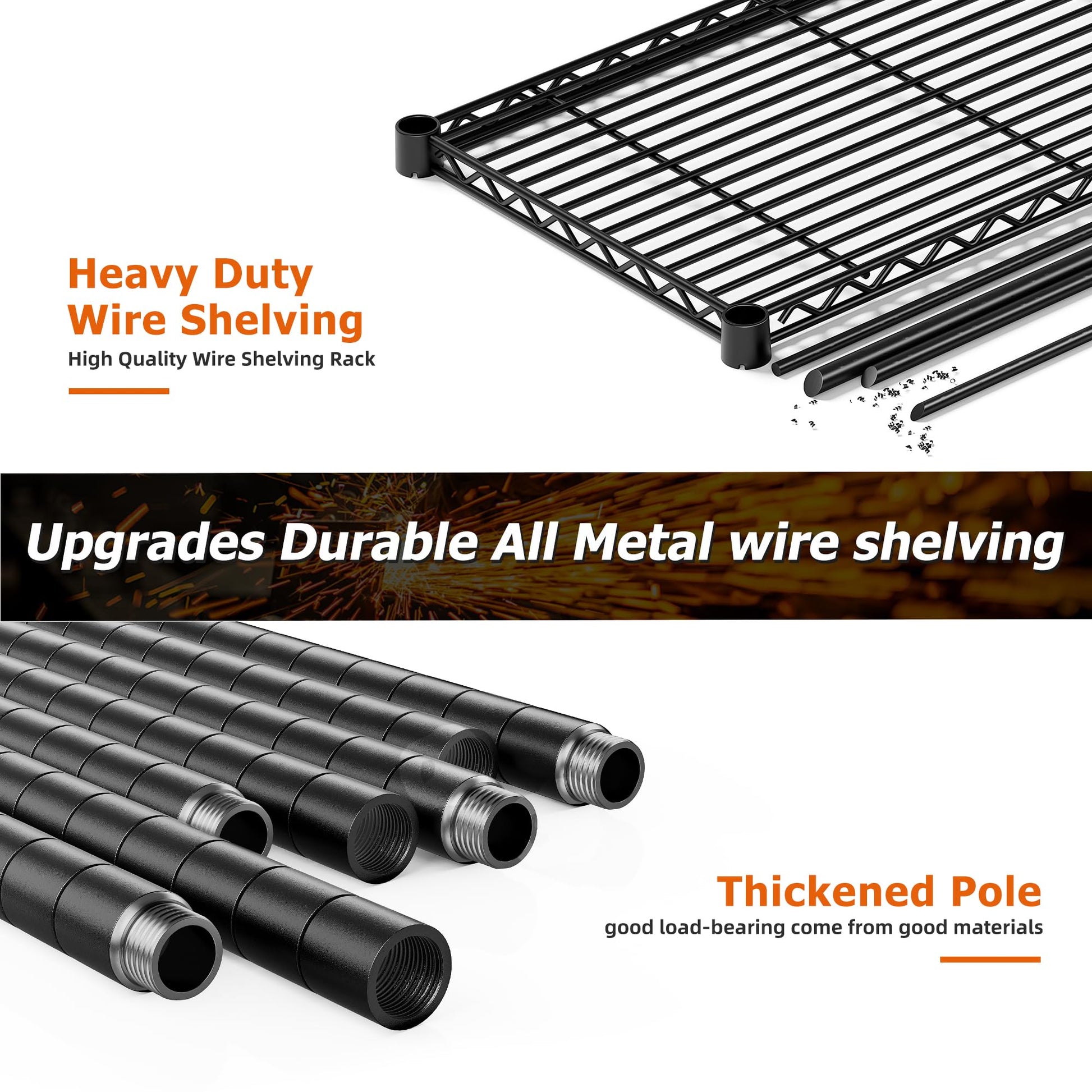 - 1600 lbs Heavy-Duty Garage Shelving: Metal shelves built with industrial-grade steel wire and reinforced shelves, this metal shelving supports up to 1600 lbs total (320 lbs per shelf). Powder-coated finish resists rust and wear for long-term, reliable use.