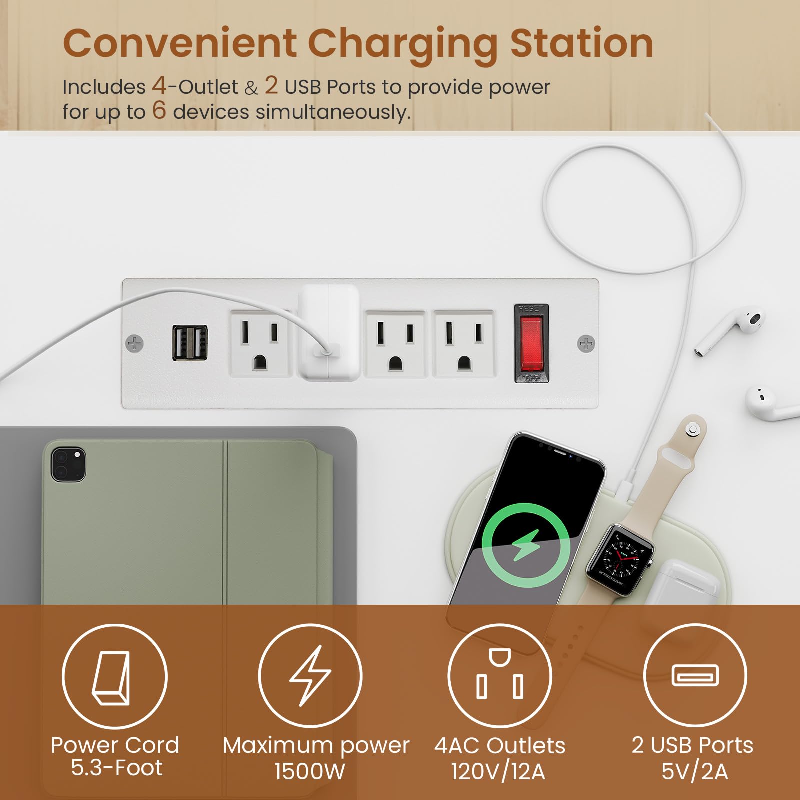 - 【Charging Port】Our charging station includes 4-Outlet & 2 USB Ports to provide power for up to 6 devices simultaneously. Also includes an on-off switch, thanks to the on-off switch, one-button power off to ensure safe electricity use, which strengthens security. Power outlet allows you to charge cell phones, tablets, notebooks, etc.