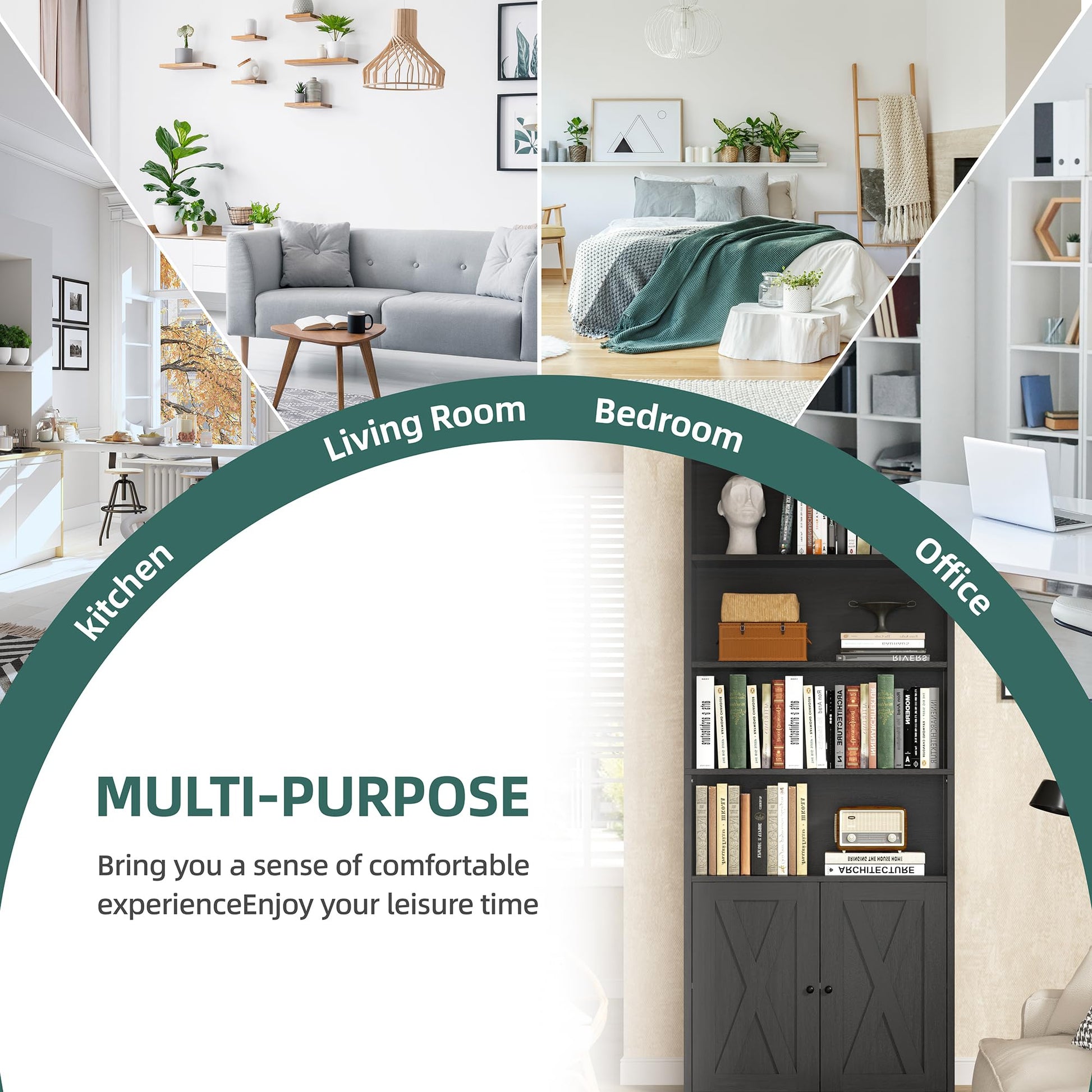 - Ample Storage Space: With 4 levels of open shelves and 2 levels of bookshelves with doors, this bookcase will meet multiple storage needs. The shelves above can be used to place books, potted and crafts, etc. Cabinets with doors below can be used to store documents, etc., so that they are protected from dust.
