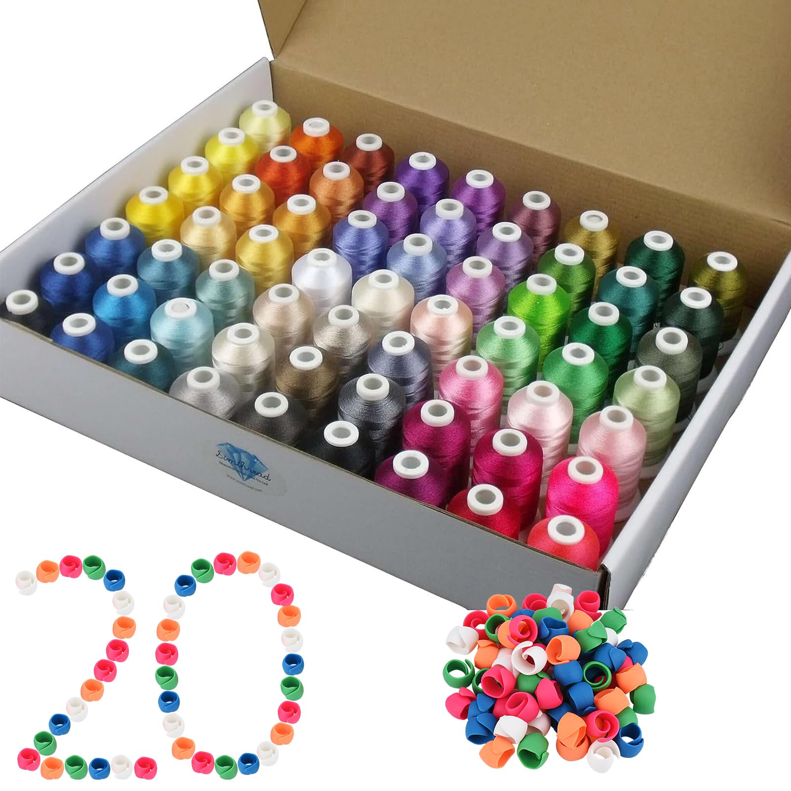 - 63 Colors + 20 Thread Holder - 63 spools variety of colors Polyester Embroidery Machine Thread brighten your Embroidery and Sewing projects. All spools are labeled with the matching brother color number. 20 Thread Holders included.