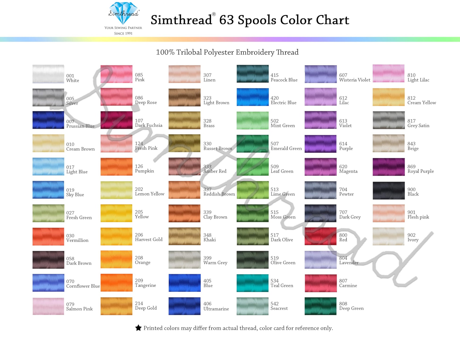 - SIMTHREAD - Over 20 years manufacture experience, giving you the incredible value Polyester Embroidery Machine Thread. Happy sewing and Embroidery your own colorful life