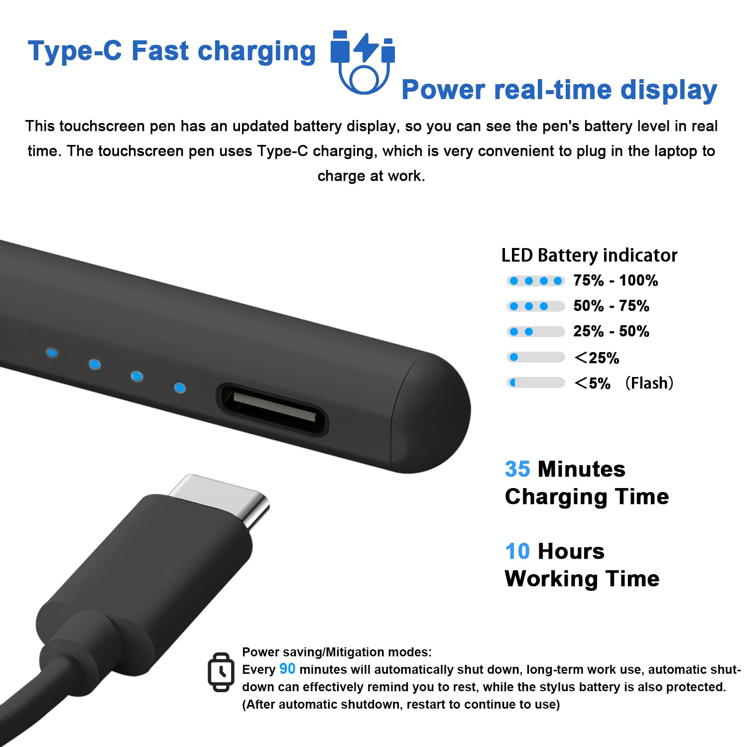 - USB-C Charging/Smart Power off: This ipad pen uses the popular USB-C charging port, which allows better connection to a computer or adapter for charging. The active stylus pen for ipad also has a smart shutdown/mitigation model that triggers an automatic shutdown after 90 minutes of work and writing, helping to remind you to rest and also helping to conserve battery power. (After automatic shutdown, restart can continue to use)