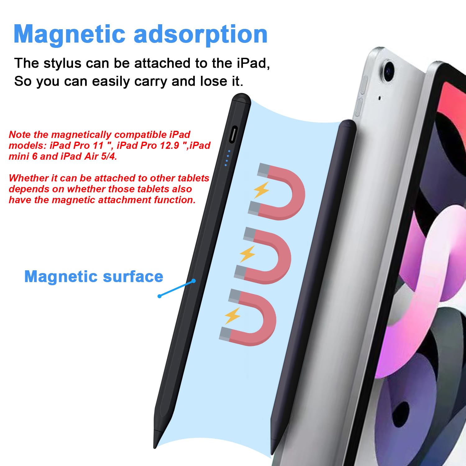 - Magnetic absorption: The ipad pencil stylus body is made of aluminum alloy. Through the magnetic adsorption function on the front of the ipad pro pencil body, when you travel or have a meeting, you can attach the ipad stylus to the side of the ipad tablet device, which is convenient to carry and is a good helper for office workers. Note: iPad models that support magnetic function are: iPad Pro12.9" (3rd / 4th / 5th generation); iPad Pro11"; iPad air4; iPad mini6