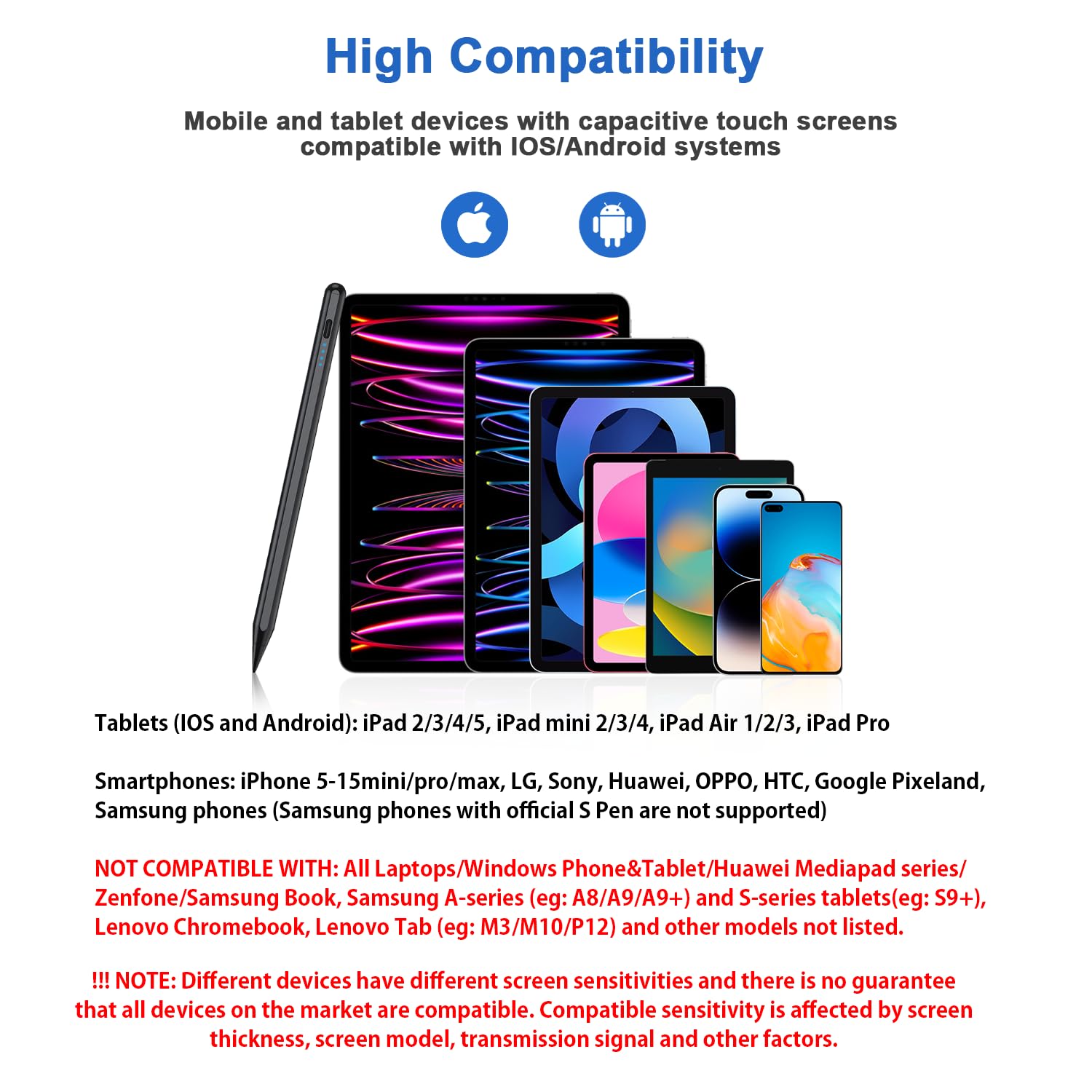 - Wide compatibility: This stylus pens is compatible with IOS and Android smartphones and tablets such as iPad /iPad Mini/iPad Pro/iPhone Pro/MAX, Lenovo, Xiaomi, Huawei, etc. [Note] Not compatible with laptops, Huawei Mediapad series, Zenfone, Xperia, Windows (Microsoft), and Samsung tablet/phone models using the S-Pen. In addition, handwriting may not work well when used on the iPad 8th generation and iPad Air 4th generation tablets