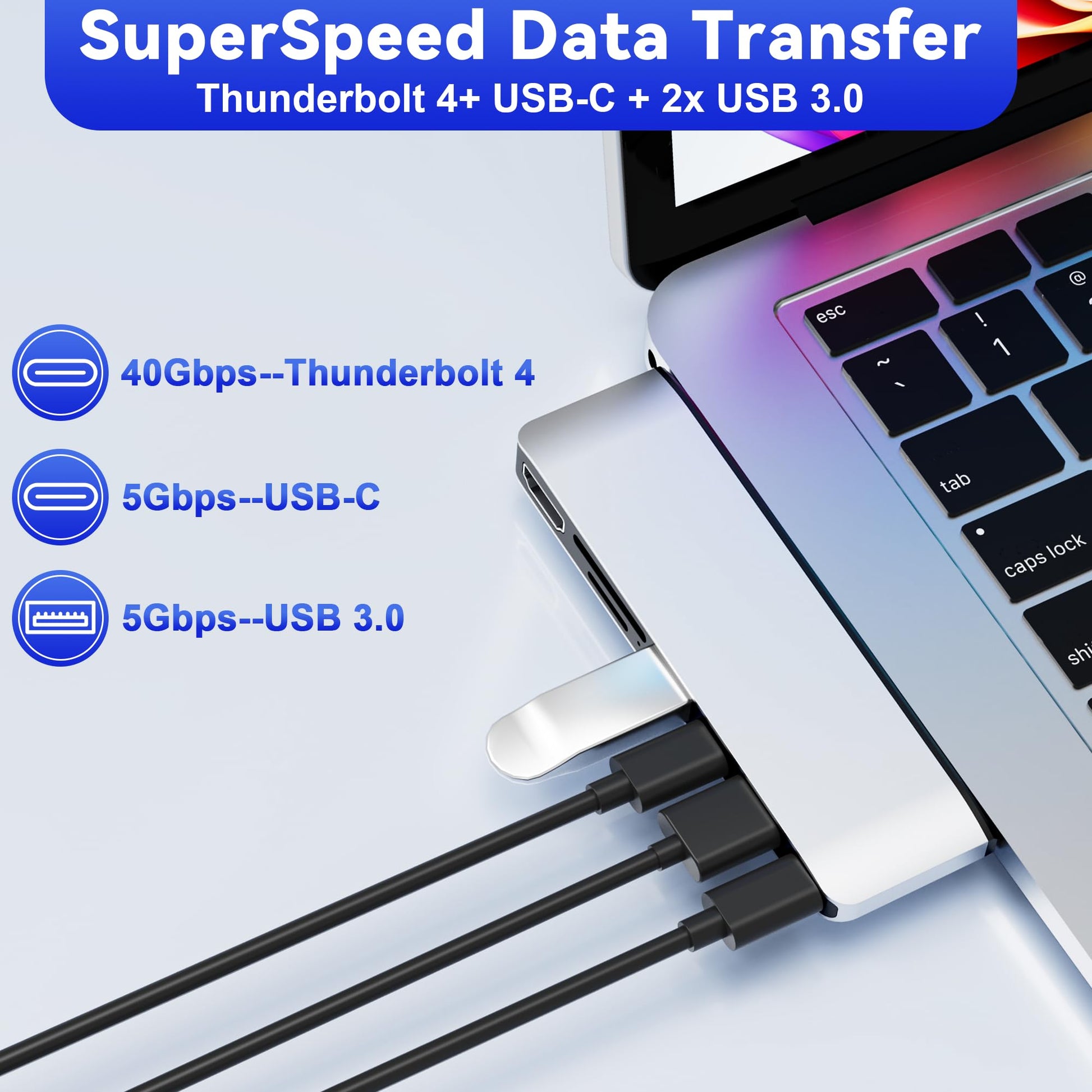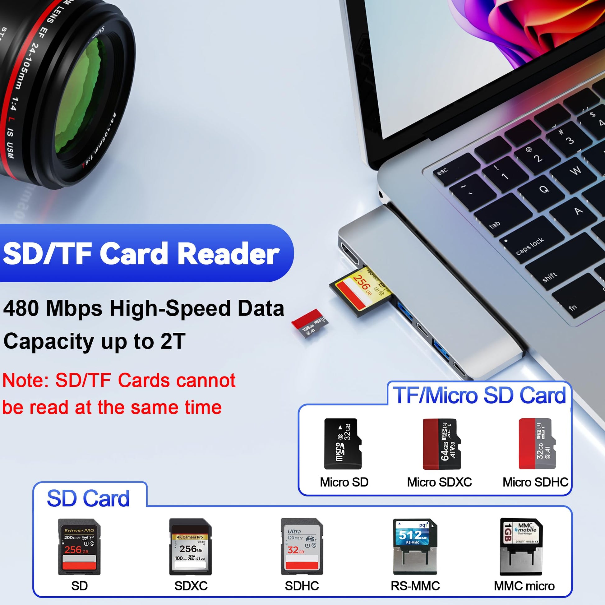 - High speed data transfer - Type C 3.1 Thunerbolt 4 supports 40Gbps data transmission, 1x Type-C + 2x USB 3.0 ports up to 5Gbps transfer. The built-in SD/TF (Micro SD) slot allows for easy access to files from SD/TF memory cards with a super speed of up to 480Mbps. Compatible with SDXC, SDHC, SD, MMC, RS-MMC, TF, Micro-SDXC, Micro-SD, Micro-SDHC, Mini-SD and UHS-I cards up to 2TB, allows you to transfer photos, videos, music and files quickly.