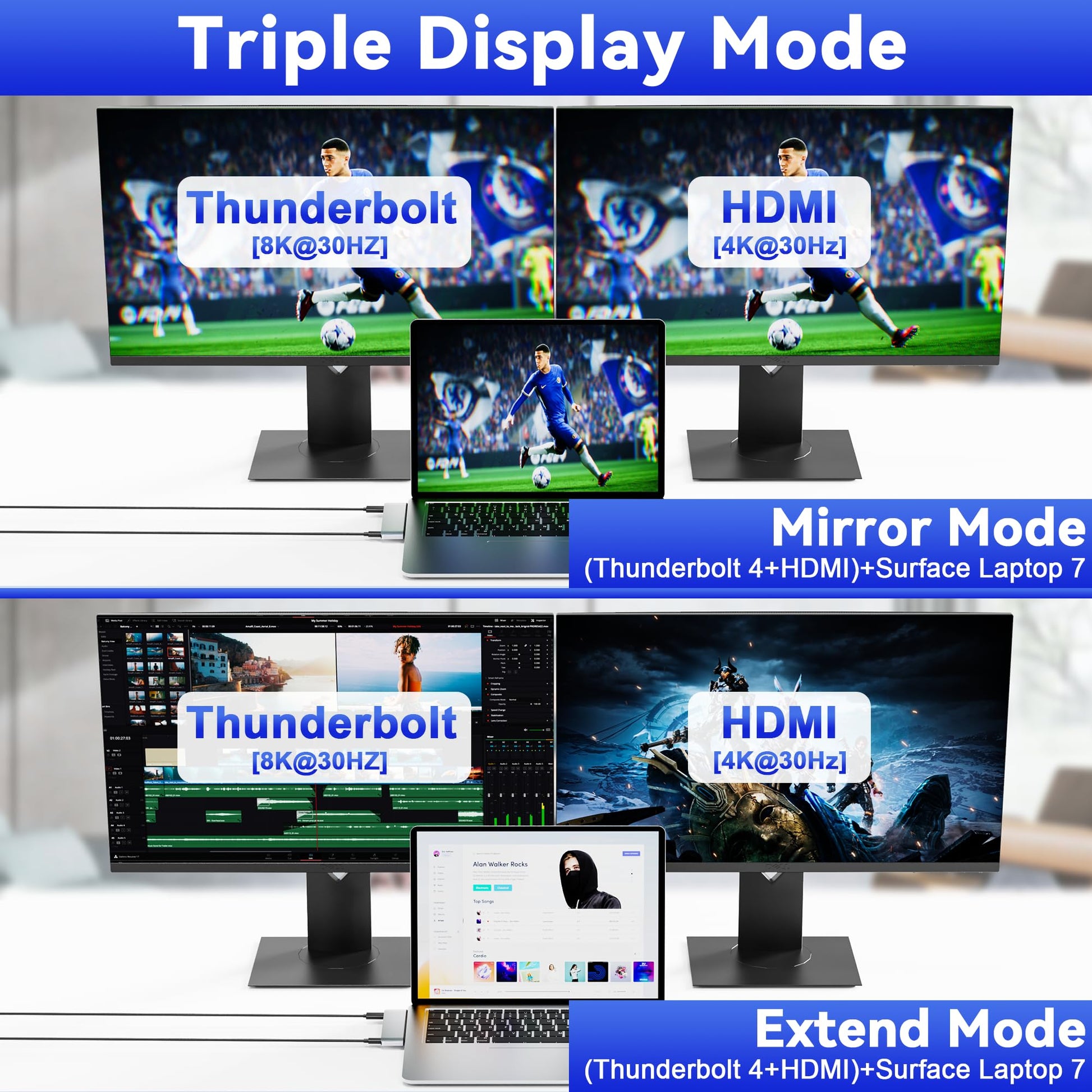 - Triple Display Microsoft Surface Laptop 7 Hub docking station - Triple display ( Ultra HD 4K HDMI + USB-C Thunerbolt 4 ) + Surface Laptop 7 modes Boost your efficiency 3 times. This hub for Surface Laptop 7 allows you to extend 2 monitors which provide more space for work and you can do different project on different monitors. Support Extend Or Mirror Mode, HDMI Resolution up to 4K@30Hz, USB-C Thunerbolt 4 resolution up to 8K@30Hz; An ideal Gadget for Video Editor, Photography, Programmer.