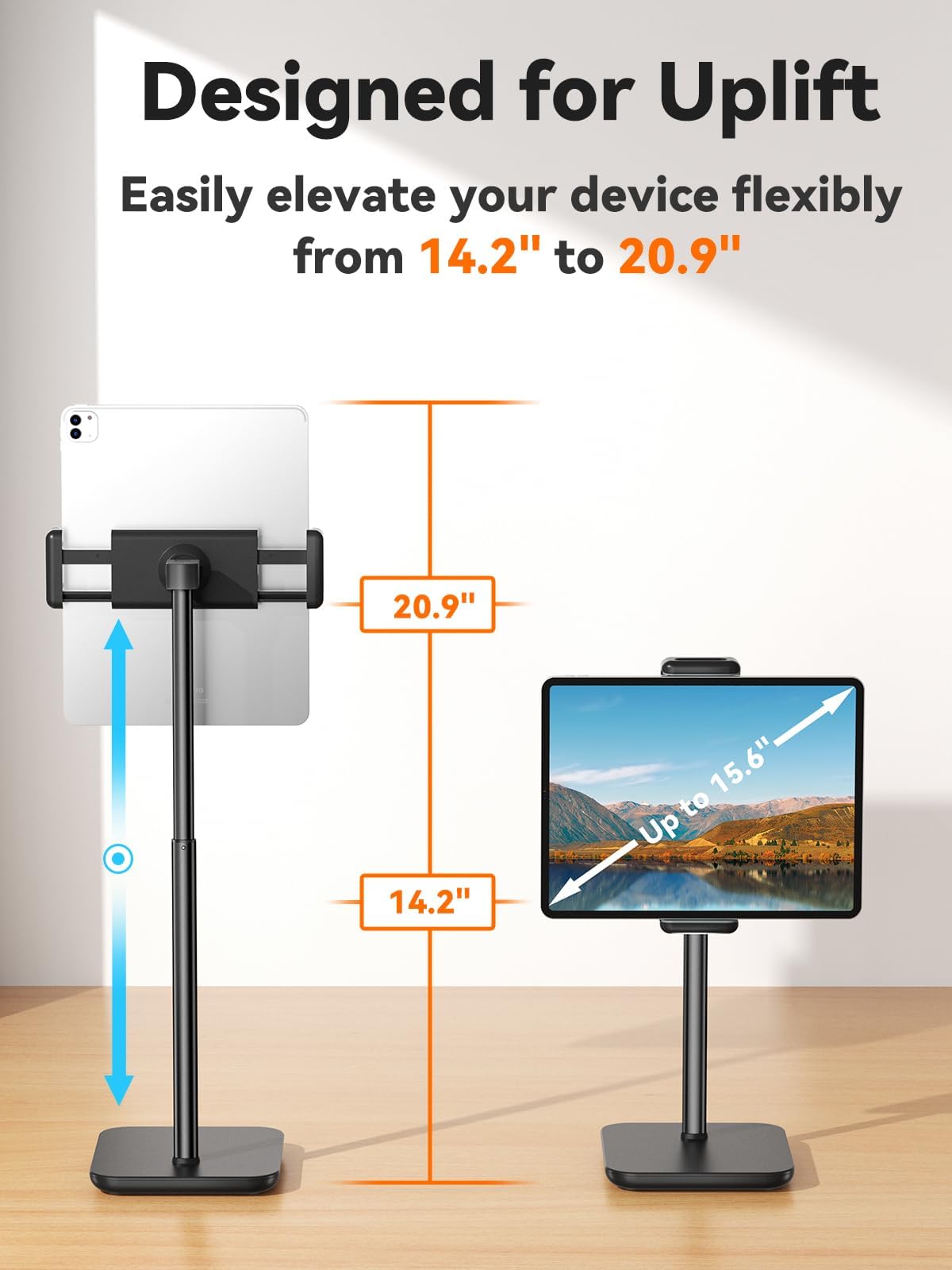 - Ergonomic Design: The tablet holder stand is designed for comfortable viewing with adjustable height and angle. The height can be adjusted steplessly from 14.2 to 20.9 inches, allowing you to adjust it to your preferred height and angle.